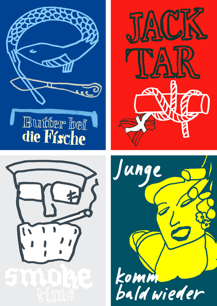Siebdrucke: 4 Motive DIN A5: Butter bei die Fische / Smoke Time / Jack Tar / Junge komm bald wieder im Mare-Kiosk des 25hours Hotel HafenCity, Überseeallee 5, 20457 Hamburg zu erwerben oder direkt: Gisela Kurkhaus-Müller Telefon und Fax +49.30.6515120 Mobil +49.171.9601828 gisela.kurkhaus-mueller@gmx.de